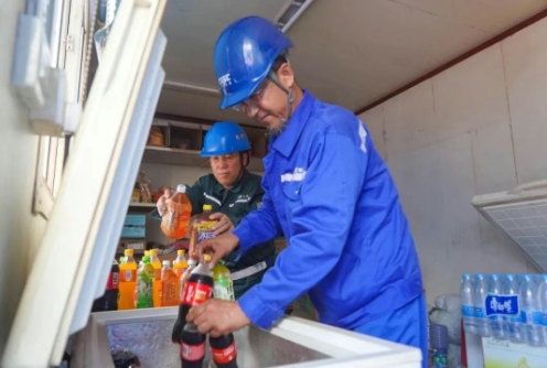 在飲食消暑保障上,大船天津構(gòu)建起全鏈條清涼補(bǔ)給體系。清涼解暑的綠豆湯成為員工餐桌上的“標(biāo)配”,供隨餐飲用;4000余箱瓶裝水以及大批藿香正氣水作為夏季防暑降溫物資配送至各部門、各協(xié)作單位班組;作業(yè)現(xiàn)場的冰柜里,清涼飲品隨時待??;為協(xié)作單位員工送上遮陽草帽,讓清涼關(guān)懷覆蓋每一位一線勞動者。