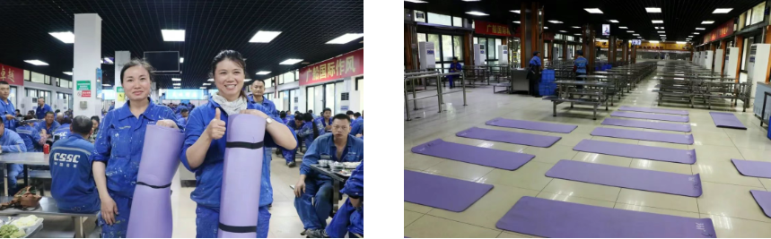 中午時分,走進廣船國際生產指揮樓食堂,十幾臺空調已經提前開啟,食堂內涼爽舒適。據(jù)介紹,該公司已經將會議室、食堂等公共區(qū)域開放給一線員工作為午間的“休憩港灣”,讓一線員工得以安心小憩、恢復體力。13個食堂內,除了不銹鋼凳子、桌子可以供員工躺下休息之外,還為員工準備了瑜伽墊。